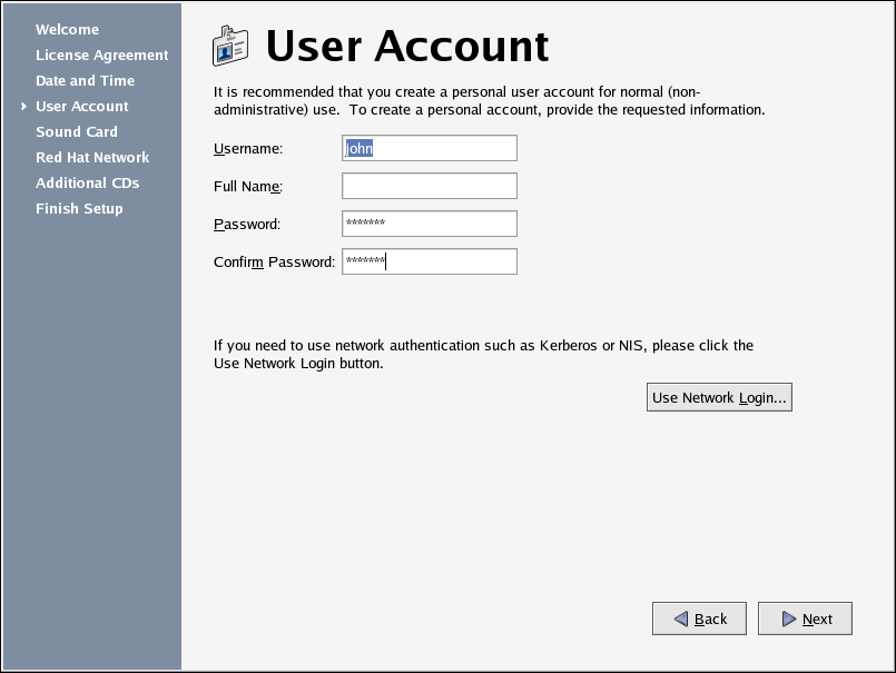 Next, you should create a user account to use on a routine basis. It is not recommended to log in to your root account for common computing tasks, as you may damage your system or unintentionally delete a file. The Setup Agent lets you enter a username, an optional full name for the account, and a password (which you must enter twice). This creates a user account that you can use to log into your Red Hat Enterprise Linux system and which has its own home directory on the system to store files.
