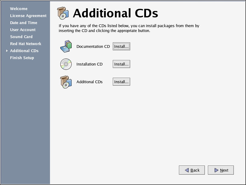 To install Red Hat Enterprise Linux RPM packages that you did not install during installation, software from third-party providers, or documentation from the Red Hat Enterprise Linux Documentation CD, you can do so at the Additional CDs screen. Insert the CD containing the software or documentation you want to install, click the Install... button, and follow the instructions.
